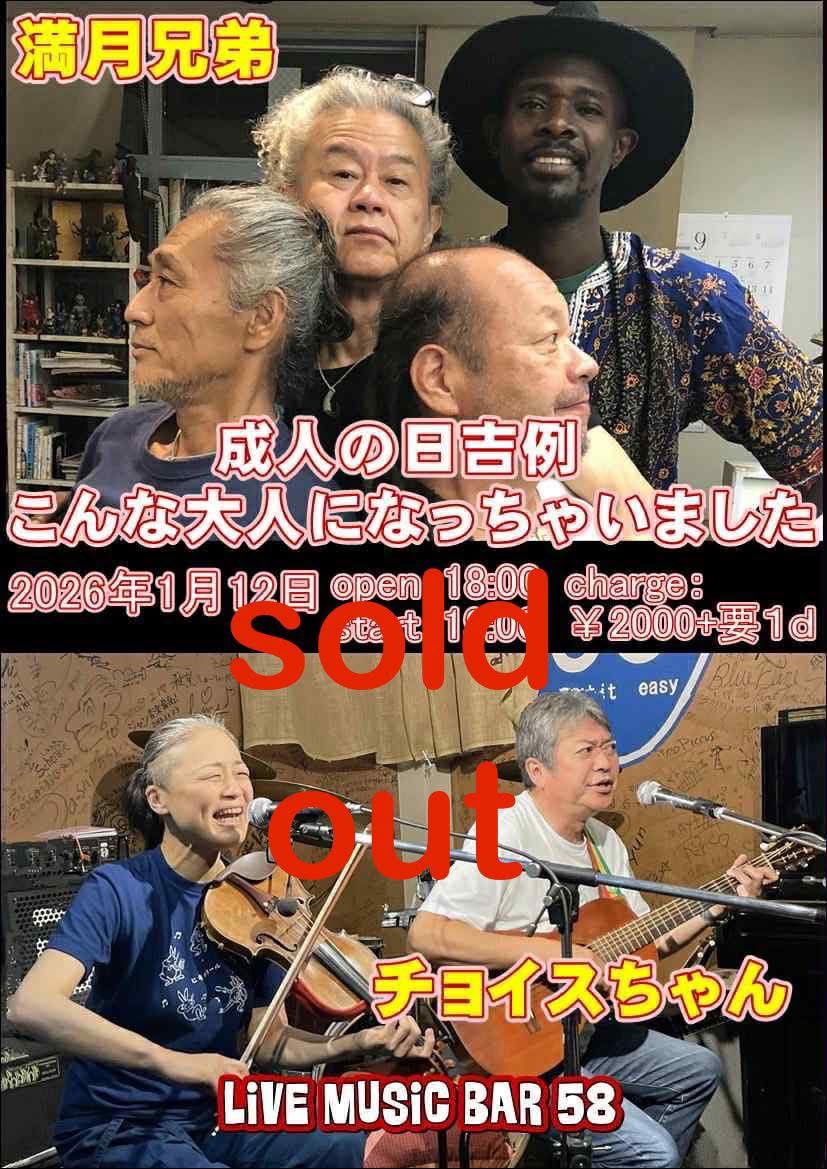 毎年恒例、山科58での満月兄弟との新年会的成人の日ライブ「こんな大人になっちゃいました」2024年はチョイスちゃん二人揃って体調不良、25年は西沢インフル罹患につき二年連続で出演できなかったのですが、2026年こそはやりますよ〜♪みなさんどうぞよろしく!!!